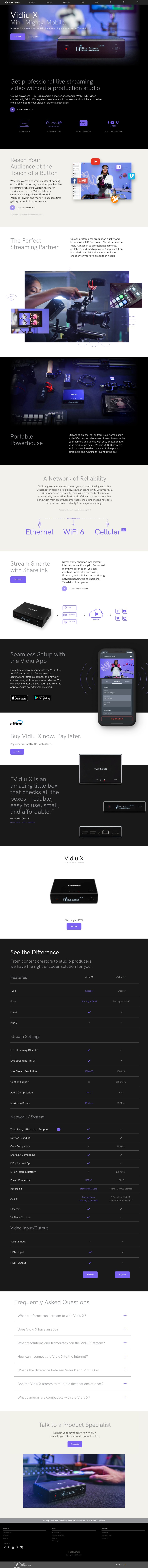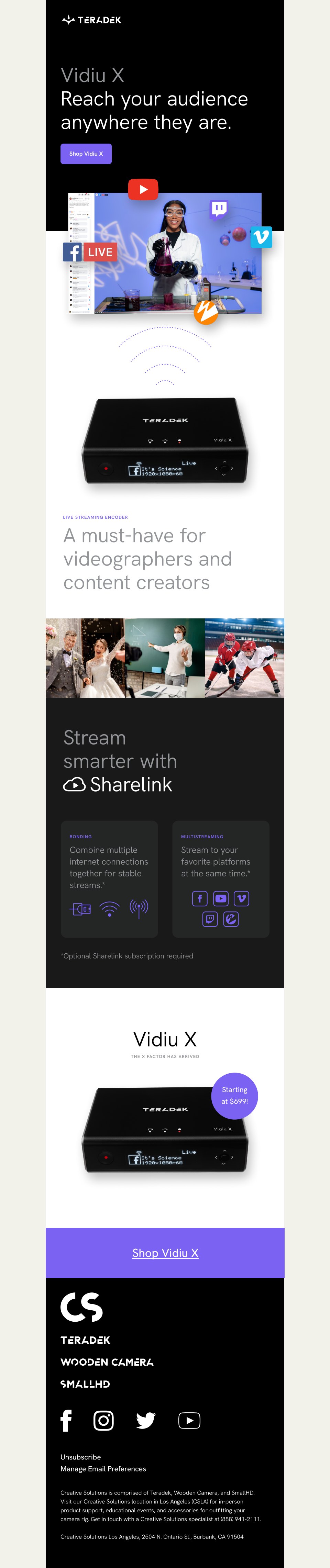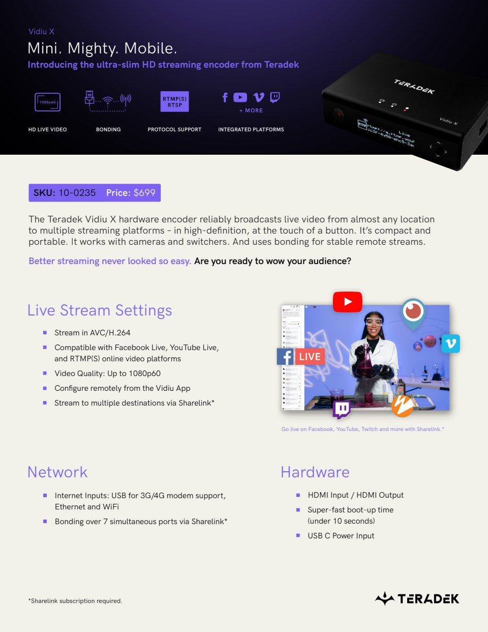Landing page, emails and cutsheet for the product launch of Vidiu X – the ultra-slim HD video streaming encoder from Teradek®.