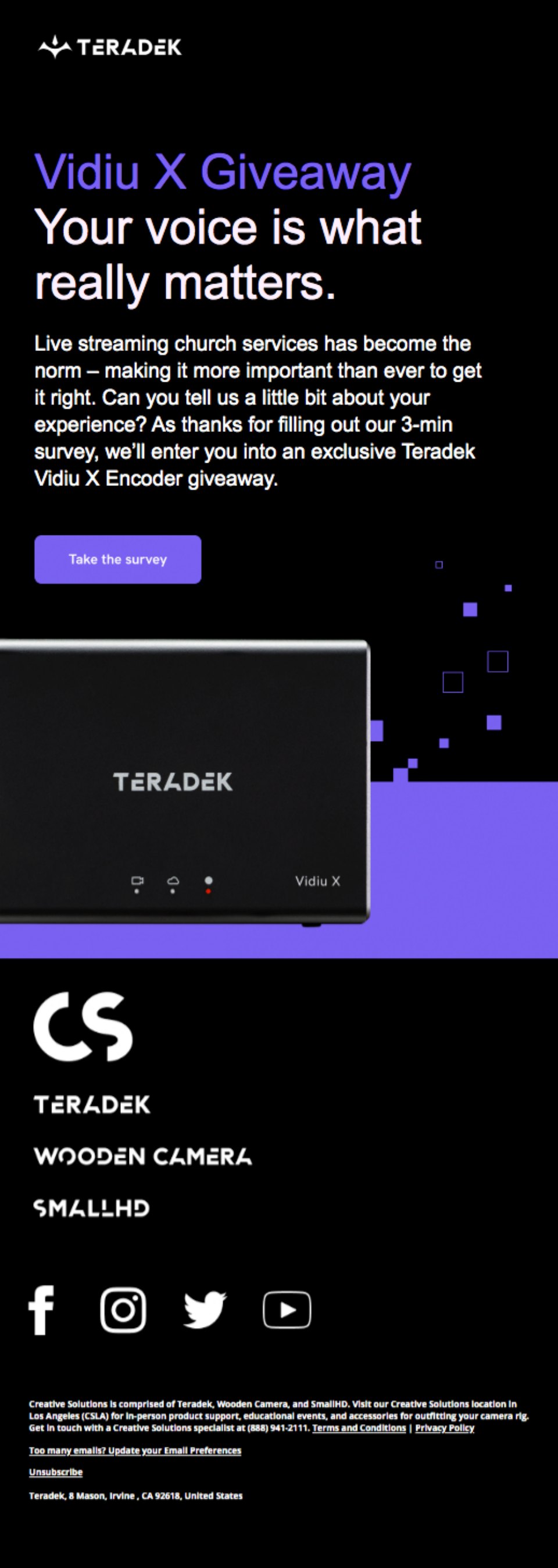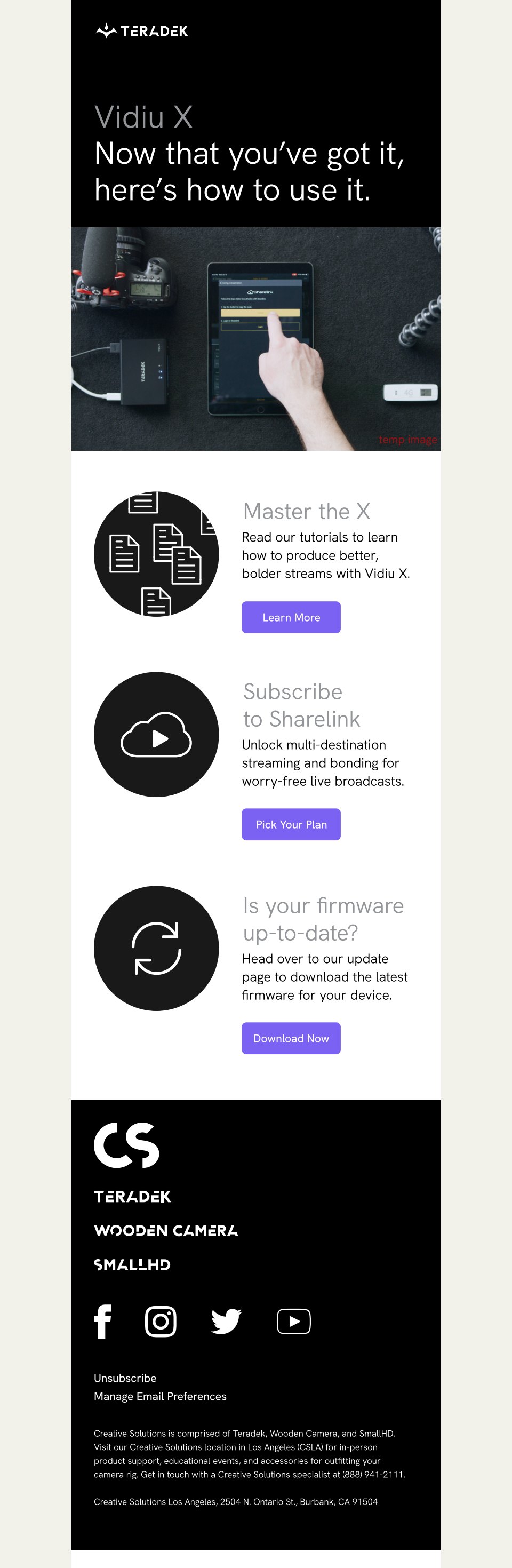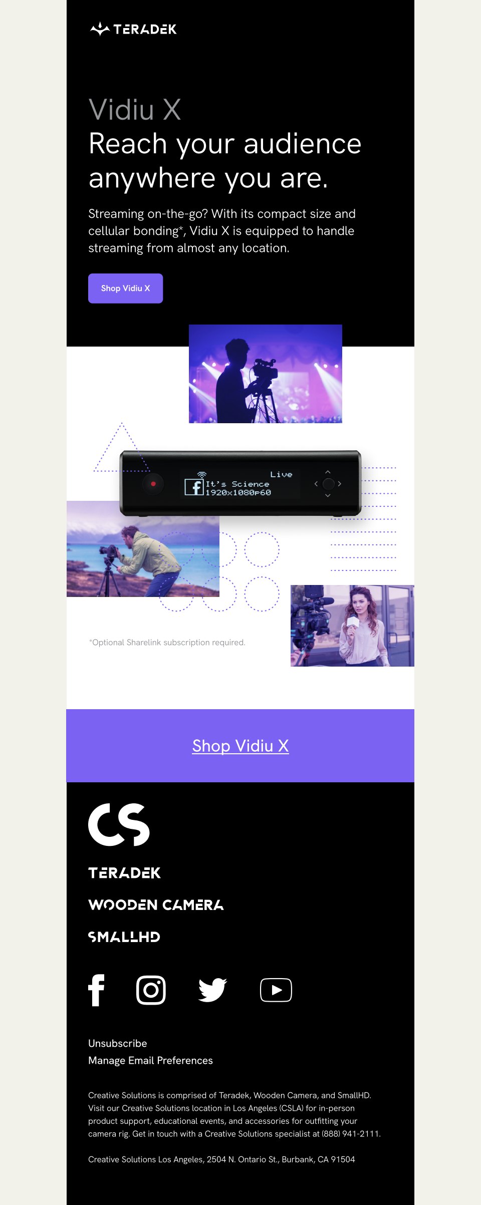 Landing page, emails and cutsheet for the product launch of Vidiu X – the ultra-slim HD video streaming encoder from Teradek®.