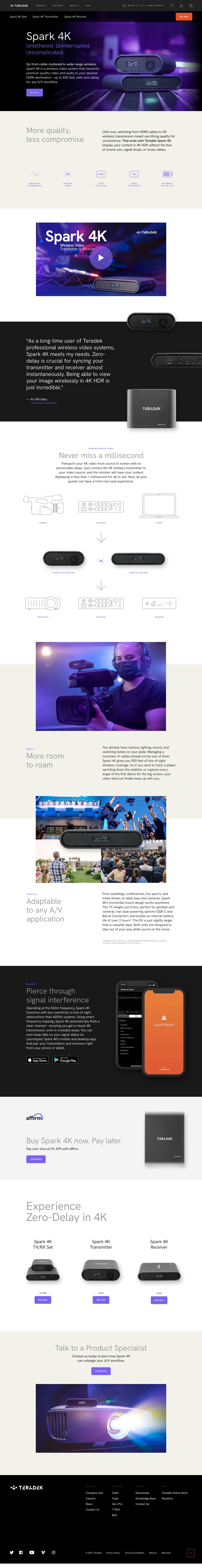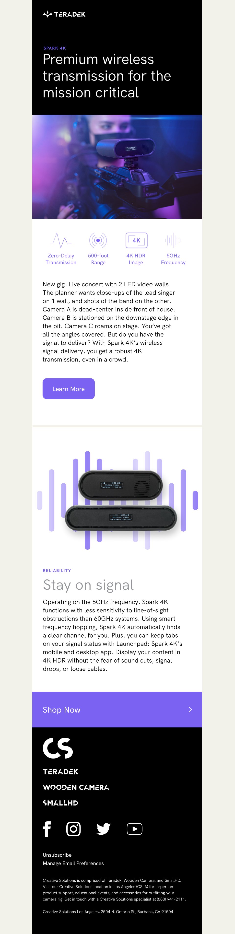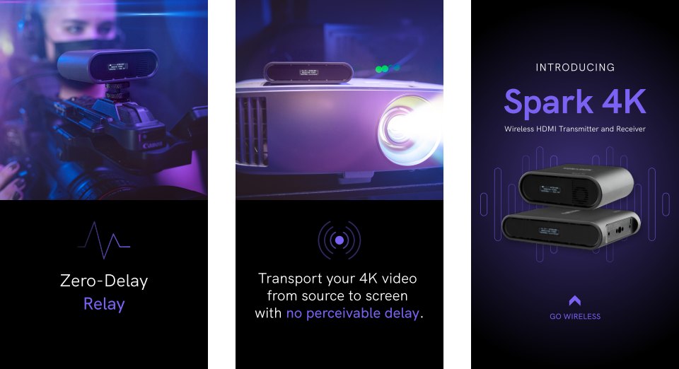 Landing page, emails and social stories for the product launch of Spark 4K – the zero-delay, wireless transmitter and receiver from Teradek®.
