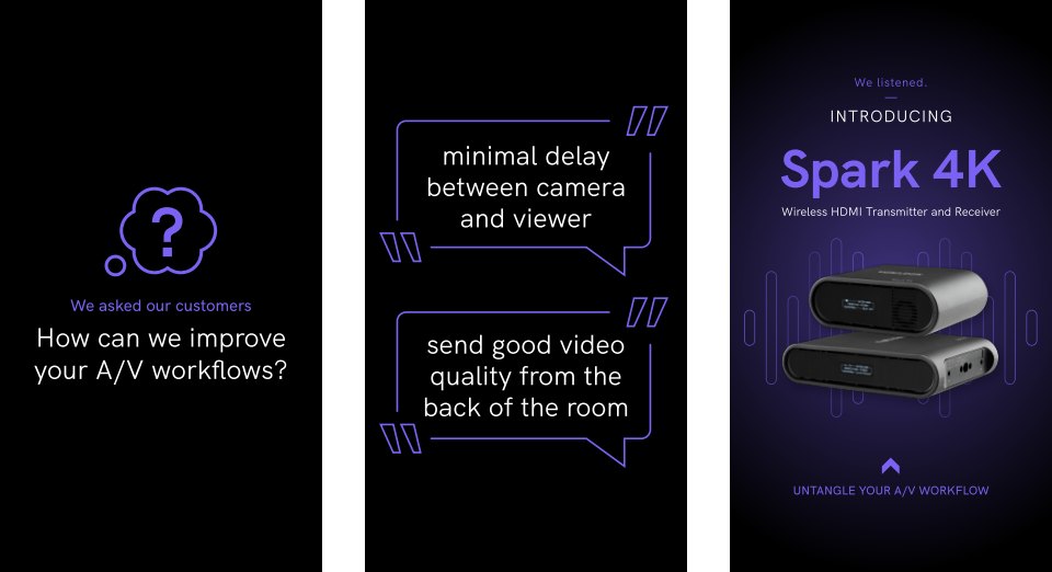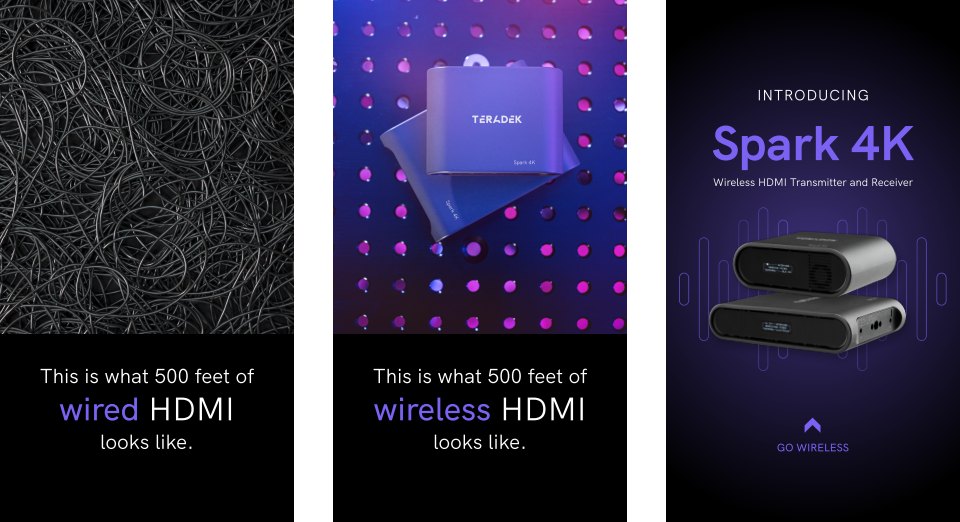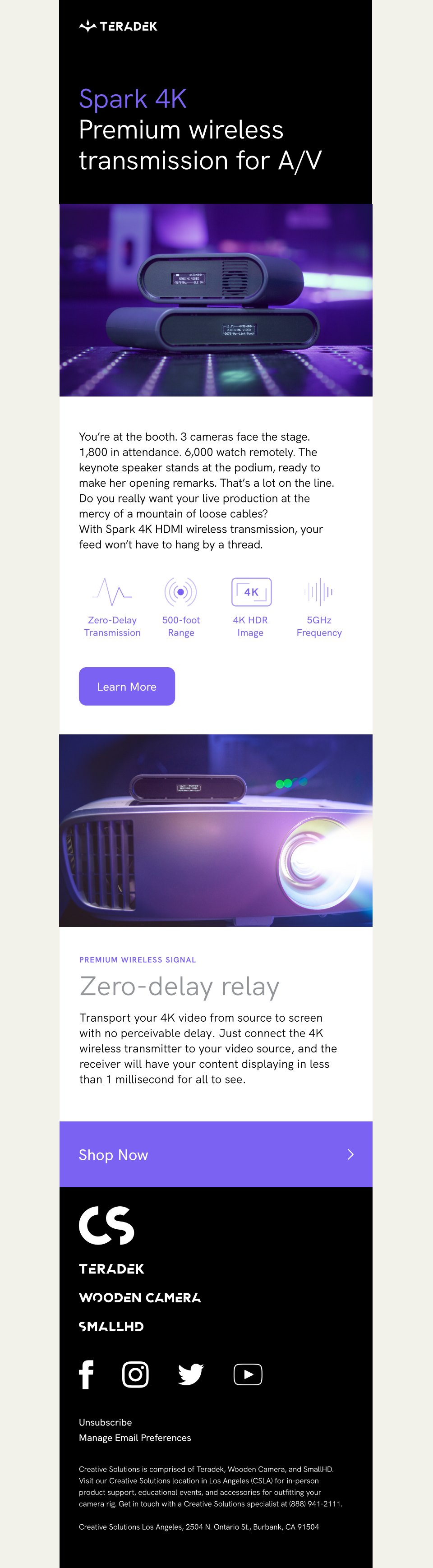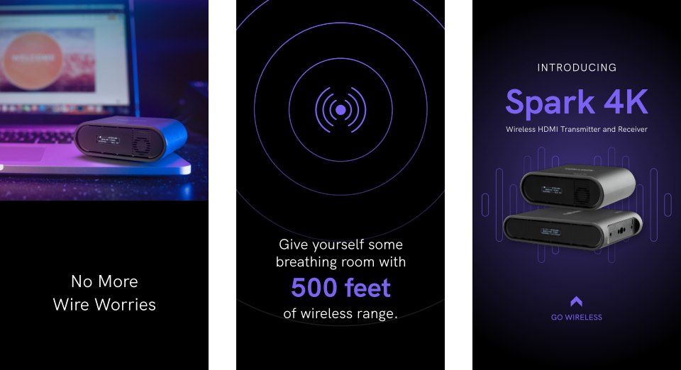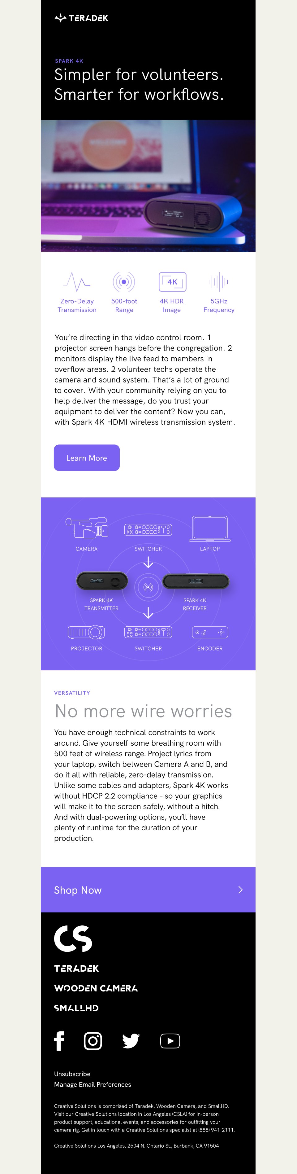 Landing page, emails and social stories for the product launch of Spark 4K – the zero-delay, wireless transmitter and receiver from Teradek®.
