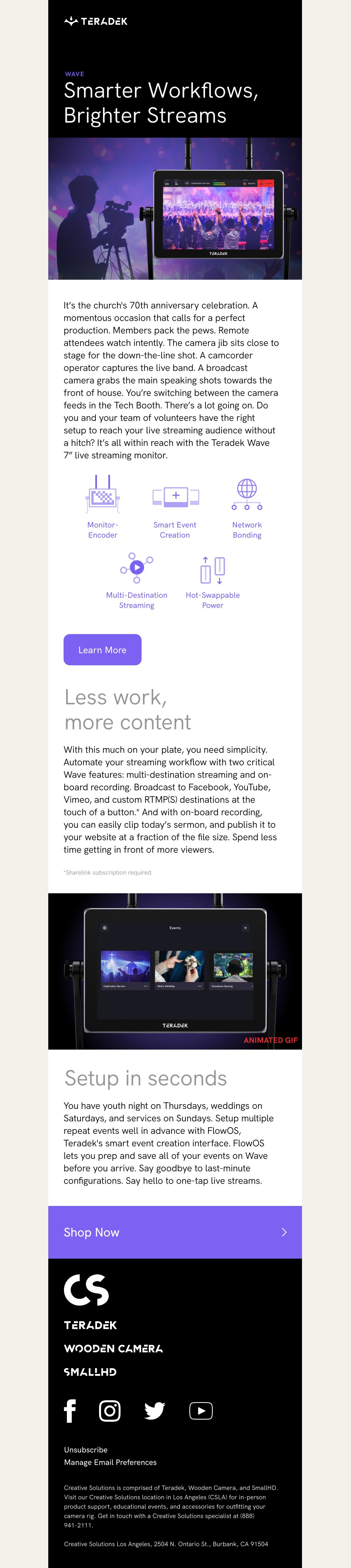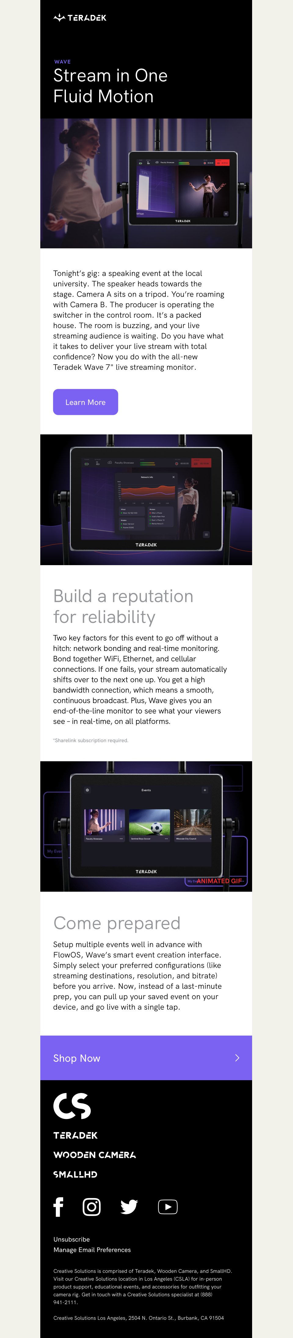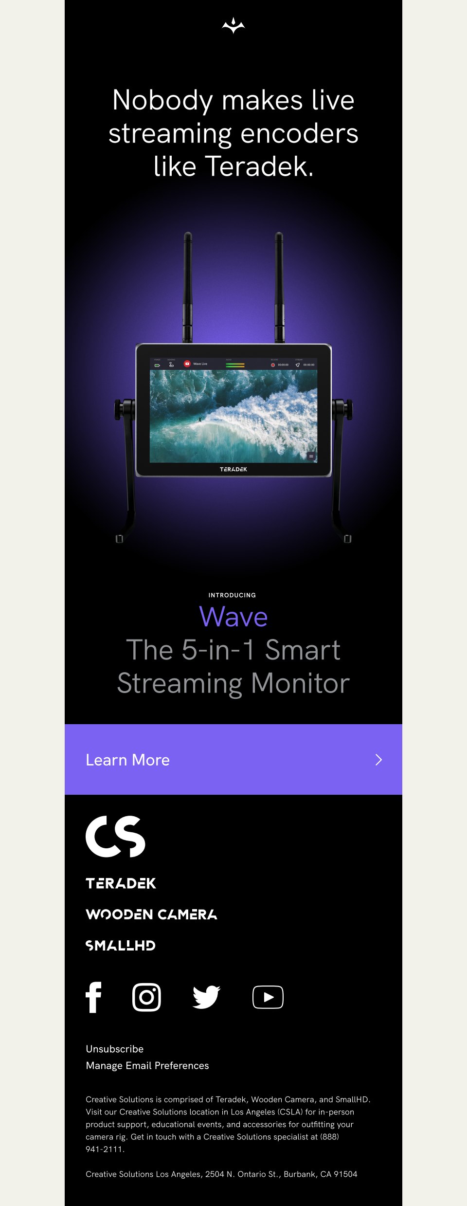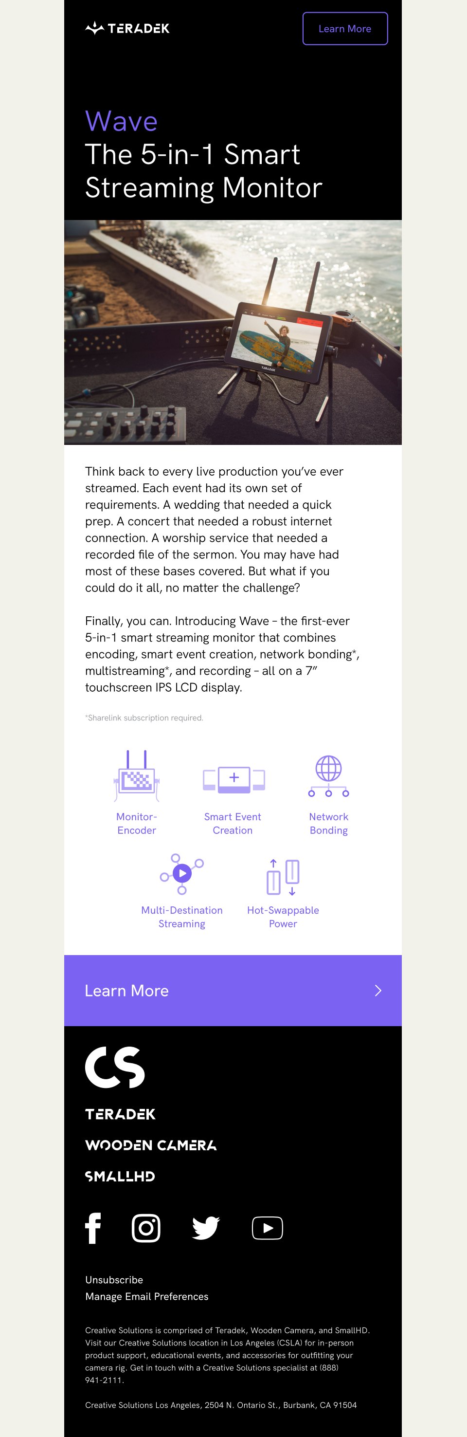Landing page, emails, and social story for the product launch of Wave – the 5-in-1 smart streaming monitor from Teradek®.