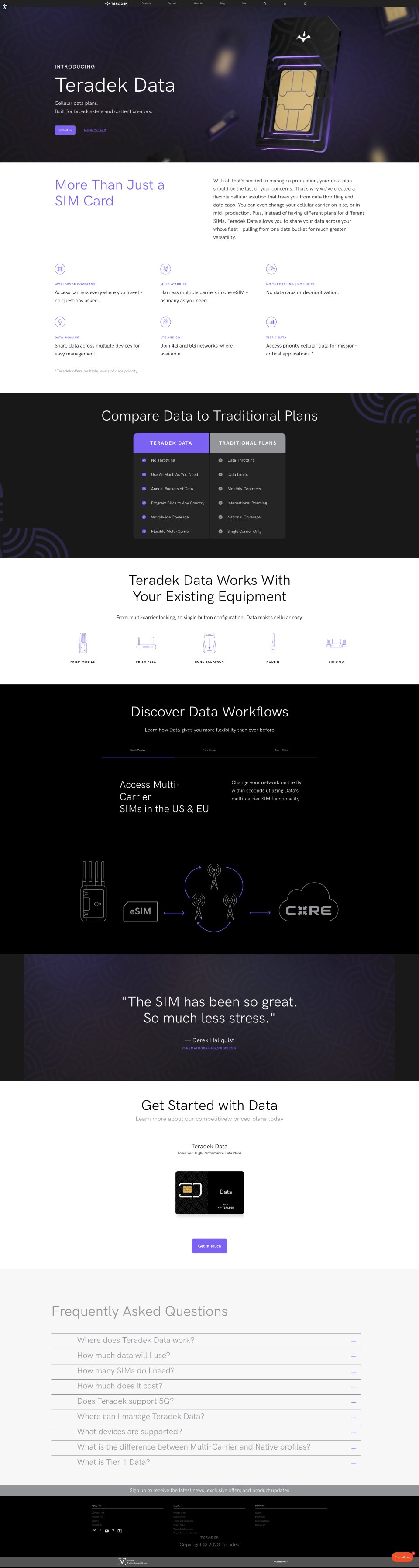 Landing page for Teradek’s custom cellular data plans. We placed careful attention to keeping the copy light and the message clear. To achieve that, we tested a few new content components, including a comparison chart, a section on product compatible devices, and a FAQ section.