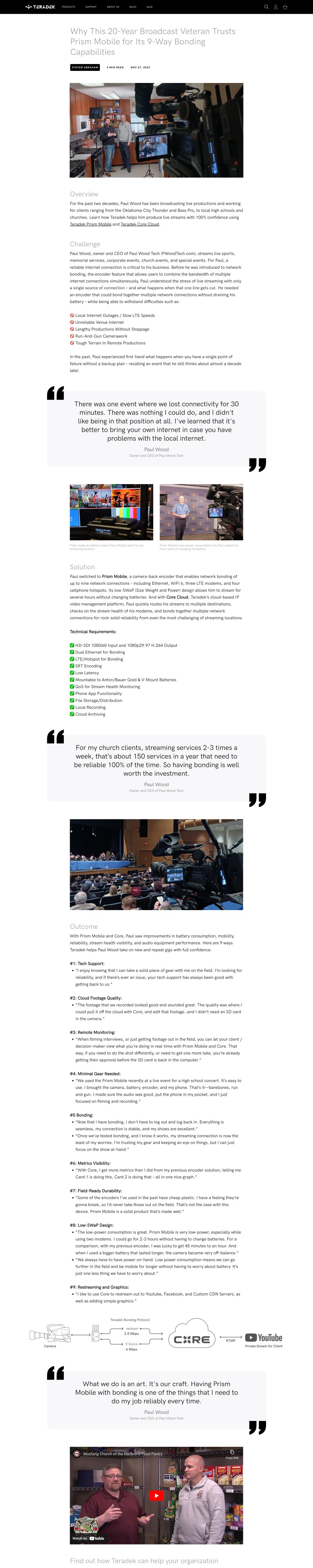 I interviewed, gathered stats, pulled quotes, and shared the story of Paul Wood, a 20-year broadcast veteran, and how he embraced Teradek’s Prism Mobile to create high-quality broadcasts – even in demanding scenarios.
