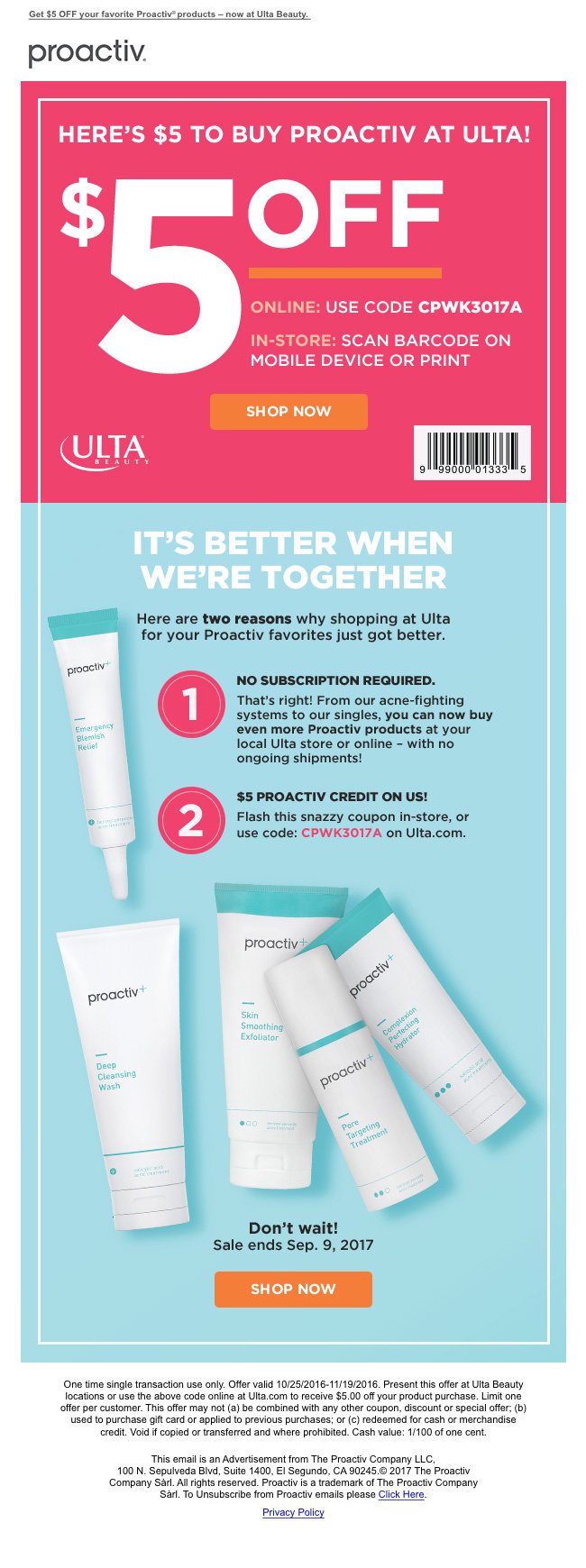 Subject Line: Get $5 OFF your Proactiv faves at Ulta Beauty!