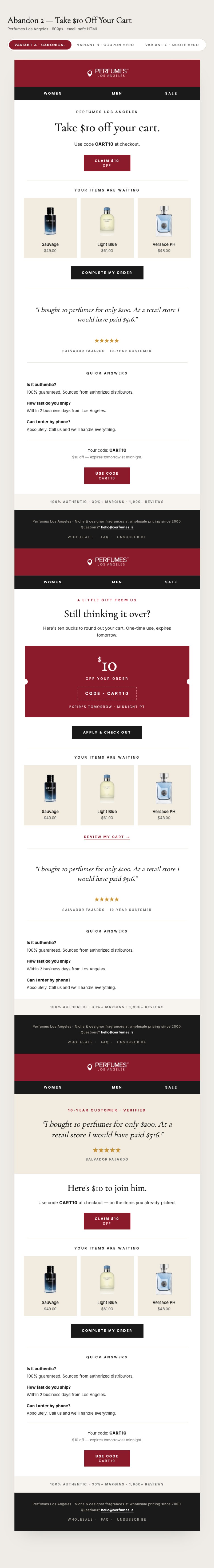 I architected nine email/SMS automations to meet customers at each moment: Cart Abandon, Checkout Abandon, Site Abandon, Browse Abandon, Post-Purchase, Review Request, Replenishment Reminder, Winback, and Sunset.